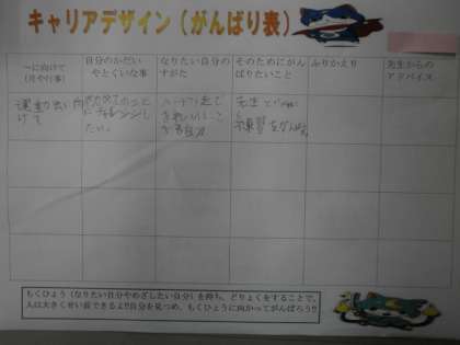 夏休みも終わり,今日から前期後半の学習が始まりました。今日は,8月〜12月までの主な行事についての見通しをたてた後に,次のキャリアデザインを考えました。「何に向けてのキャリアデザインにする?」と尋ねると「運動会です!」とすぐに答えていました。運動会に向けて,なりたい自分として「ハードル走をきれいにとべる自分」ということを決めました。理由を尋ねると,「ハードル走は4年生から行う新しい競技なので,チャレンジしたいからです」と初めてのことに対して「がんばりたい」という思いを持っていることを感じ,わたしも,とてもうれしく思いました。そのためにこれから一緒に練習をしていきます。運動会での役割だけでなく,競技1つに対しても,「がんばりたい」という思いを持っている事,とても素敵だと思います。このキャリアデザインも達成できるよう,しっかりと支えていきたいと思います。