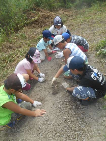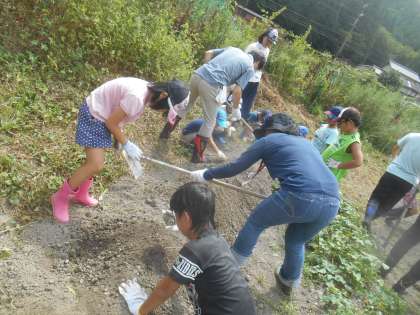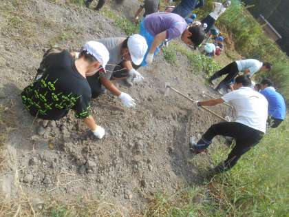 草ひき、草刈りをして、耕しています。耕して、肥料を入れています。そのあと、もう少し耕しながら、土の中に交じっている雑草を取り除き、うねにしました。しっかり耕していないと大根が地下へ大きく育たないであろうという事で、頑張りました。種まきを30センチほど間隔をあけて一つの穴に2粒程度入れておしまいです。種まきをしたところが分からなくならないように、みんなと声をかけ合いながら連携して進めました。水やりもたっぷりしました。次は、間引きや草ひきです。