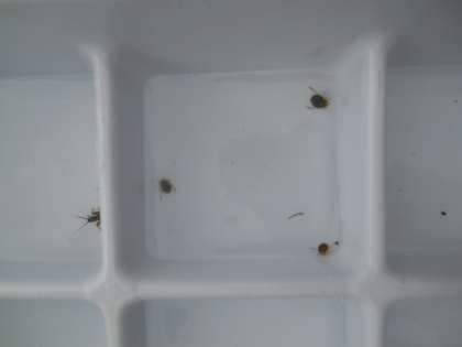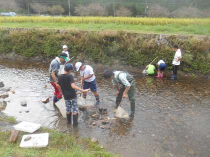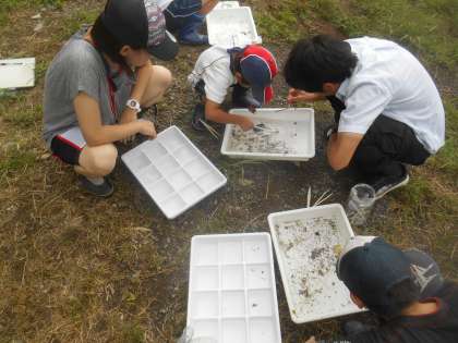生き物を調べました。指標生物から静原川が4段階のうちのどのレベルかを判断します。今年も、1番うえの「きれいな川」という事が分かりました。川底の生き物を捕まえて、分類して確かめました。