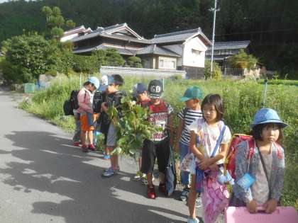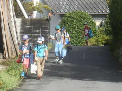時間に合わせて、集団登校の集合場所へやってきます。うさぎのエサをもって登校する児童もいます。ちょうど集合場所にクズが生えていて、地域では草刈りをして取り除いている植物ですが、うさぎにとってはえさになります。登校のついでに持てるだけもっていくという難しくない活動です。意識をするだけで、料理の時に出る人参の皮やキャベツの外側やシンを児童が声をかけて家の人からもらって持ってくるだけでもエサの確保になります。集団登校の今日のリーダーは、今日から長期宿泊で3泊4日分の荷物を持っていましたがしっかり歩いていました。