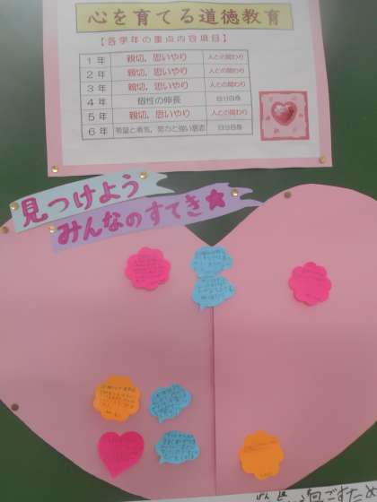自分のクラス以外の人の素敵に注目しようという取組です。ハートに早速見つけた素敵を書いて貼っていました。