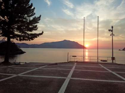 もうすぐ夕食です。食堂からは美しい夕日が見えます。遠くに見えるのは京都です。