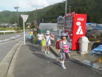 きまった時間に集合して、700mほど列を作って遅れないように歩きます。荷物の多い日もありますが自分のものをもって歩きます。バスを降りて、みんなと歩きます。