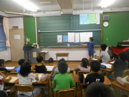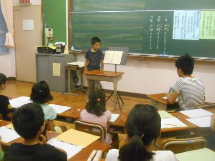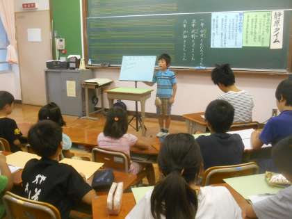 静原タイムです。フラッシュカードで、話す項目を明示しての発表、実際に使っているノートを見せての発表、学習の足跡掲示しての発表など見えるものの工夫をしていました。