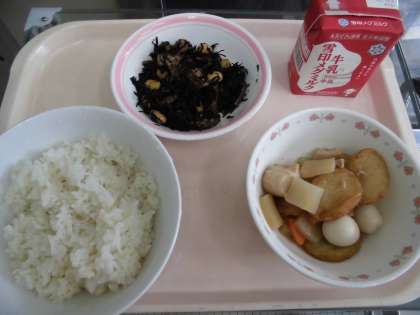 麦ごはん 牛乳 平天とこんにゃくの煮つけ ひじき豆