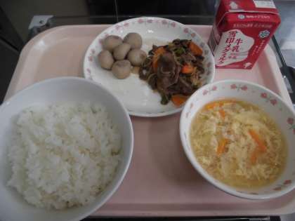 【月見献立】ごはん 牛乳 牛肉のしぐれ煮 里いもの煮つけ キャベツのかきたま汁