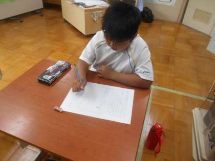 書き写しを、自分で気づき進めています。1時間目は、体育なので、先に体育のできる服装に着替えています。見通しをもち、自分で進めます。書き写しも一定の時間で終わるように意識して進め、やり終えて、1時間目に臨んでいます。書き写しは、400字詰の半分に見本がかいてあり、それと同じように空いている半分の所に書きます。