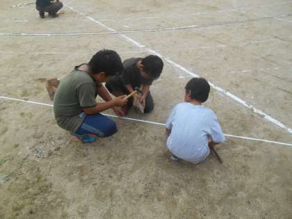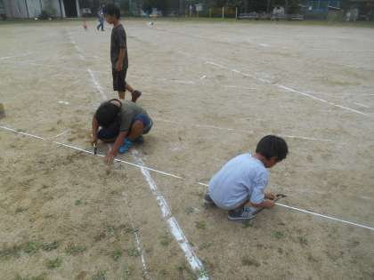 運動場のポイントを打ち直しし、ラインテープの設置をしています。テープを止める釘打ちを手伝っています。
