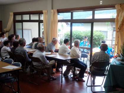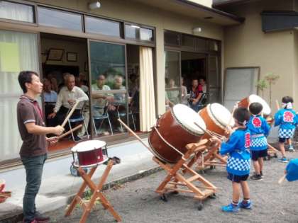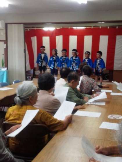 静原地域の敬老会に例年子どもたちがお招きいただき、お祝いの言葉をお伝えしたり、楽器を演奏したり、歌ったりして、静原のおじいさん、おばあさんに喜んでいただいています。始めに出演したのは、太鼓クラブのメンバーです。低学年が中心ですが、元気な演奏に大きな拍手が巻き起こりました。その後、1年生と参加者の皆さんで静原校の校歌を歌いました。