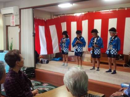 太鼓クラブの演奏に続いて、低学年から順に歌や演奏のプレゼントをしました。