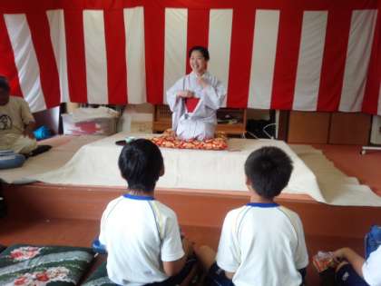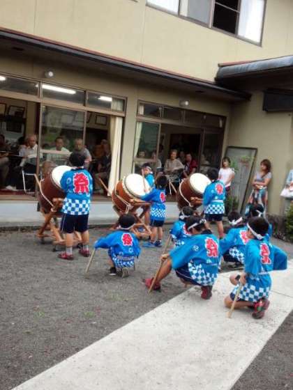 出し物の最後はやはり静原伝承太鼓です。1年生から4年生が力を合わせて演奏しました。その後の演目の落語をお年寄りと一緒に楽しませていただいた子もいました。地域の皆様、保護所の皆様、ありがとうございました。