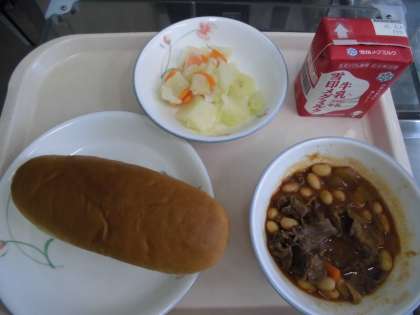 ミルクコッペパン 牛乳 大豆と牛肉のトマト煮 野菜のホットマリネ チーズ