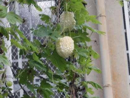 緑のカーテンも終わりになってきています。花も終わり、実ができています。白いゴーヤ、フウセンカズラは緑です。