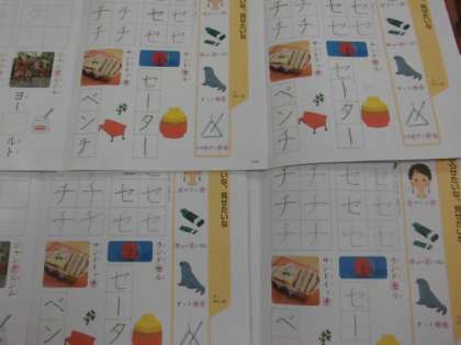 カタカナの練習です。2人組で、書いた文字を見合います。指摘を受けて直します。どのような文字がよいのかが分かっているから指摘もできますし、指摘も受け入れられます。ただ、書いて終わりでなく、手本のようにかくことが目的としてしっかり持っています。常に、丁寧に書く週刊にもなっています。
