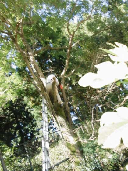 かなり、太い目の枝を切っていただきました。倒れる方向も運動場になるように設定しての作業でした。切り倒した後、運びやすいように小さく切りました。葉っぱには、緑の丸い実もついていました。
