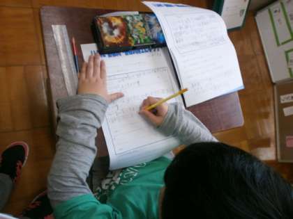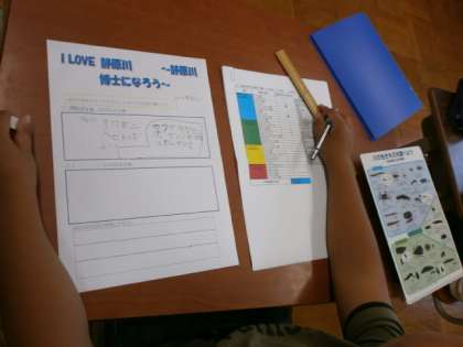 今,4年生では,総合的な学習の時間に「ILOVE静原川」という単元の学習をしています。昨年度は,静原川に住む生き物について調べ,調べた事を発表していましたが,今年度は,3人がそれぞれ自分の課題を持ち,課題に合う方法で調べ学習を進めています。「静原川とその下流に住む生き物の違いを調べたり比べたりする」や「地域の方,子どもたち,保護者の皆さんに静原川のいい所等をアンケートをとり,集約する」,そして「静原川をよりよくするため,何か問題はないか地域の方にインタビューしてみる」等,それぞれが自分で「知りたい」と思った事を課題にしています。より深く静原川を知り,愛着が持てるよう学習を進めていきたいと思います。