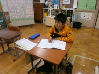 今日の1時間目の国語の時間に,新出漢字をしました。新出漢字では,文章表現力を高めるために,学習した漢字を使って,文章を考えて書くようにしています。電子黒板に「いつ」「どこで」「だれが」「何を」「どのようにした」といったキーワードやヒントとなるような言葉を提示したものを見ながら,自分で文章を考えています。昨年度から行っていますが,最近では,文章を考える時間が早くなったり,より長い文章を考えたりできる時が増えてきました。また,1時間の間に何文字書きたいかを自分のめあてとしてたててもいます。同じ学習活動でも,めあてを持つことで,より意識が高まったり,昨年度と比べての成長を実感したりすることができます。