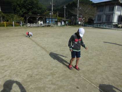 パスゲームの学習を始める前に,児童が役割ごとに準備を進めています。運動場に引いてあるラインテープが見えるように土をどけ,学習の場作りも自分たちでできるようになってきました。