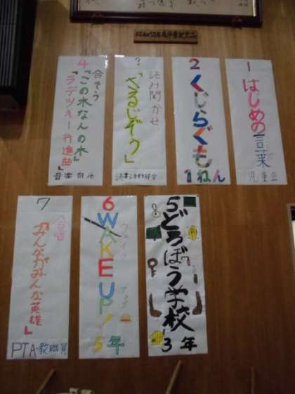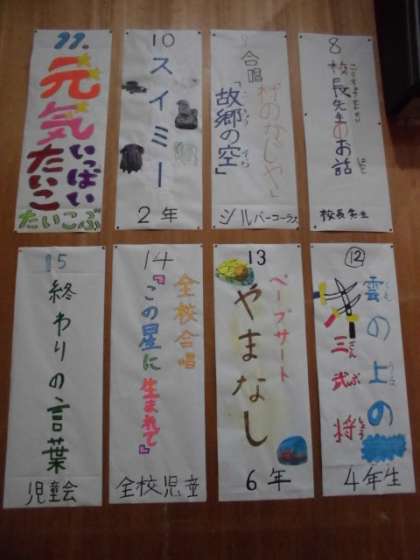 プログラムを掲示しています。各出し物についての思いも込められたものになっています。大きな紙に字配りよく絵も入れて表現する事は、書写の学習の発展でもあります。