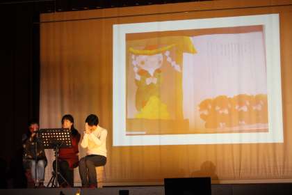日頃の読み聞かせの拡大版です。ピアノ伴奏もあり、絵本は、大きくスクリーンに映し出されました。