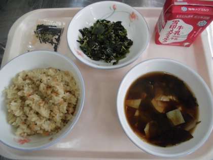 麦ごはん 牛乳 とりそぼろ丼(具) ほうれん草とじゃこのいためもの 赤だし