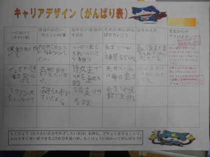 学習発表会を終えて,次のキャリアデザインを考えました。次は,マラソン大会に向けて考えました。昨年度をふりかえり,課題として,「歩いたり,2周までしか行けなかった」ということから,「3周走りきる自分」になりたいという目標をたてました。その為にも,普段の練習の時から歩かずに走りきるということをがんばりたいと言っていました。新しい目標を持ち,次のキャリアデザインも達成できるよう,これから一緒に練習していきたいと思います。