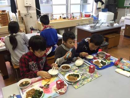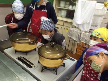 自分たちで作った米「希望のヒカリ」を家庭科の時間にガラス鍋で炊いて食べました。一度練習をしていたこともあり,どの鍋もふんわりと上手に炊けていてとてもおいしかったです。子どもたちはおかわりをしてたくさん新米のおいしさを味わっていました。