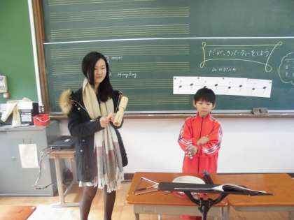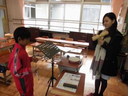 外国語指導助手(FS)も参加し,「だがっきパーティー」をしました。ウッドブロック,トライアングル,クラベス,カスタネット,小太鼓,すず,タンブリンを用意し,好きな楽器を選んで「かぼちゃ」の曲に合わせてリズムを打ちました。違った音が重なるおもしろさを感じながら楽しく学習しました。