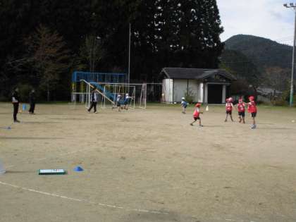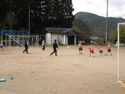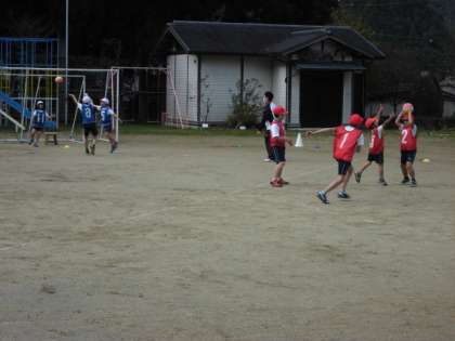 チームでパスの練習をしてから、ゲームになります。コーンを並べての場づくり、コート準備はその前の活動です。自分たちで準備をして、ゲームになります。パスは、相手のいないところ、ゴールに近づいてもらうことを意識して動きます。パスをする方は、相手のいないところにいる人に素早くパスをすることがねらいとなります。それに向けての練習をしていました。