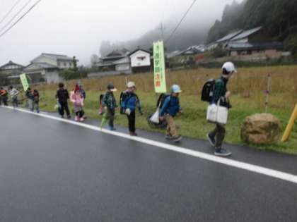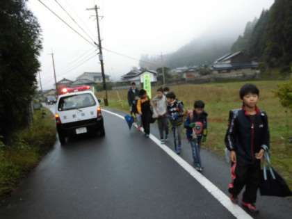集団登校のリーダーとして、集合整列の遅い人への「速くして」と声かけをするなどして、早く学校に行けるようにすすめています。雨上がりの靄のかかる中、パトカーに見守られ登校しています。