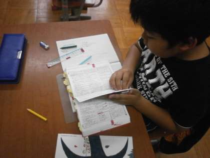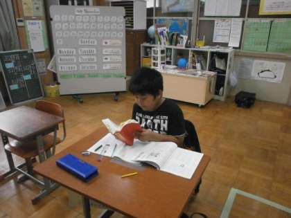 今日の1時間目の国語の時間に,慣用句について学習をしました。国語辞典を使って,いくつかの慣用句の意味を調べ,教科書の穴埋め式になっている文章に,当てはまる慣用句を考えたり,調べた慣用句を使って文章を書いたりしました。国語辞典は,昨年度から使っていることもあり,時間はかかるものの,活用することができます。調べたい言葉を見つけると,「ありました〜!」とうれしそうに言いながら,意味を見てました。その後,文章を書く際には,「水を打ったよう」を使い文章を考えていました。調べるだけではなく,活用することでよりその言葉の意味を理解することができました。