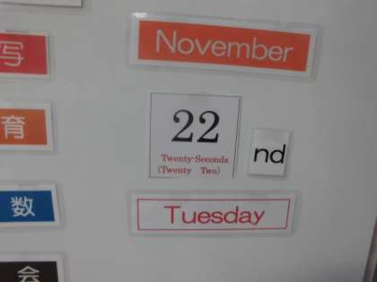 英語でのやり取りを朝の会で続けています。今日は何月ですか。何日ですか。何曜日ですか。天気はどうですか。ごきげんいかが?などやり取りを続けているので、「ノーベンバー」「トゥウェンティーセカンド」など身に付いてきます。今日は担任がいなくても進めることができました。