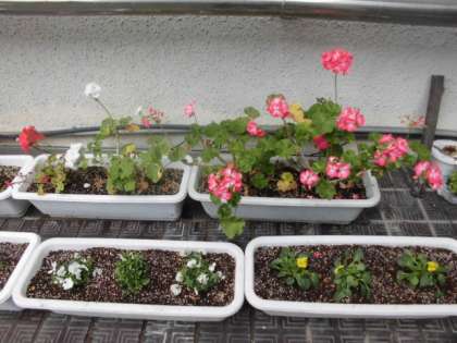 菊がきれいに咲いています。冬が近づき、カランコエはこれから冬対策に入ります。春に向けて、パンジー、ビオラも植えられています。