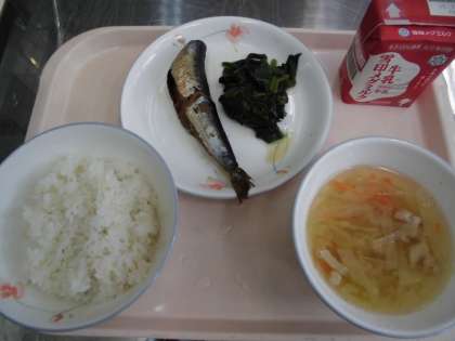 麦ごはん 牛乳 いわしのかわり煮 ほうれん草のおかか煮 キャベツの吉野汁