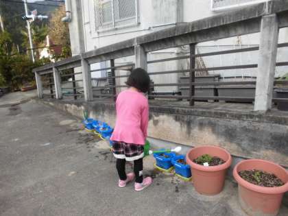 球根を植えた後が気になるようです。みると少し芽が出ていました。みんなの花が咲いてほしいなあと言いながら、水やりを始める児童もいました。すでに、芽が出ていることを何人かの児童は知っていました。自分のやったことで、花が咲くことに順調につながるか見に行っています。