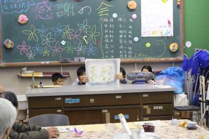 感謝の気持ちを伝えるために一人一人の方に色紙の寄せ書きを渡しました。また,今までの米作りの様子を紙芝居にして感想とともに伝えました。