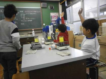 今日の4時間目の理科の学習で,水をあたためるとどのように変化するかを実験しました。前回の学習では,温度の高くなった水は上のほうへ動き,ひくい温度の水が下がるということを確認しましたが,実験を行うことにより,視覚的にも内容を理解することができ,知識を深めることができました。次の時間は空気はどのようになるのかを予想し,検証していきたいと思います。