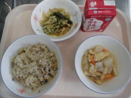 胚芽米ごはん 牛乳 とりめし(具) アスパラガスのおかか煮 かぶらとおあげのたいたん