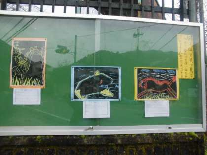 1月の掲示板は、版画作品です。黒い線彫り版にきれいな色を付けています。