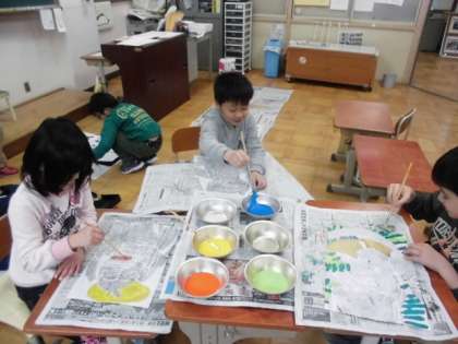 年末に刷った版画に色付けをしました。紙にインクの油がしみこんでいて、色のしみこみが良くないところもあります。