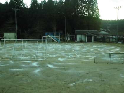 氷ができるほどの冷え込みに、運動場が凍結するようになりました。凍結防止剤を散布しました。