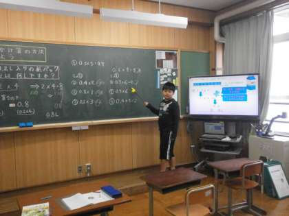 今日から,算数では,「小数のかけ算」の学習に入りました。3年生のかけ算ではなかった,小数の概念が入ってきた学習です。例えば「0.2×4」は「0.2を10倍する」「積を10で割る」という作業が必要になってきます。最初はとまどいをみせていましたが,やり方が分かるとどんどん問題を解いていくことができました。黒板に自分が計算した答えや,考え方などを書き,説明する時間もとるようにしました。説明することで自分の考えた事も整理でき,より理解も深まります。