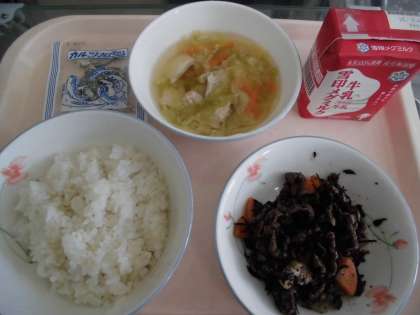 麦ごはん 牛乳 牛肉とひじきのいため煮 キャベツの吉野汁 じゃこ