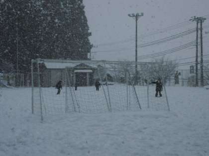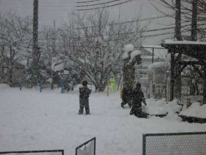 雪が降っていますが、雪で遊びたくて、運動場に出ています。