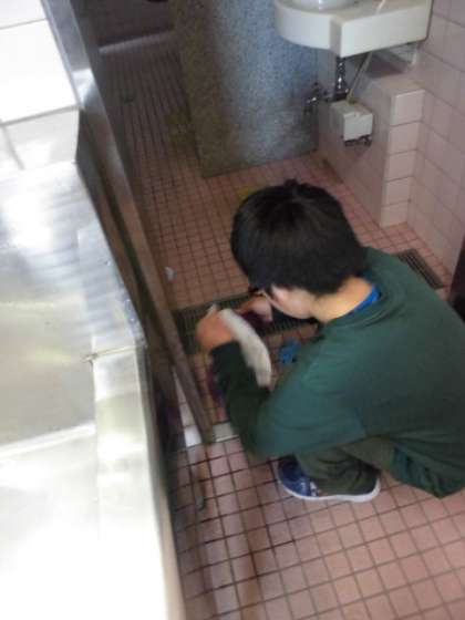 トイレのスリッパをきれいに並べています。雑巾でも拭いていました。