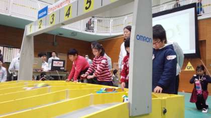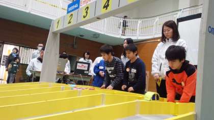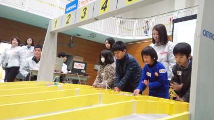 美しく作られた10メートルのレーシングコースを6人ずつのグループで走らせます。タイムはセンサーで測られ、瞬時に映し出されます。スタートの前にしっかりゴムをまいて、車を上から指で押さえて、合図とともに走らせます。緊張の一瞬。出場した子どもたちの車は、勢いよくスタートすることができました。