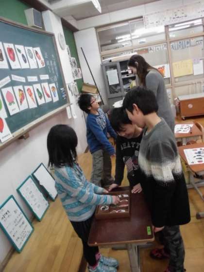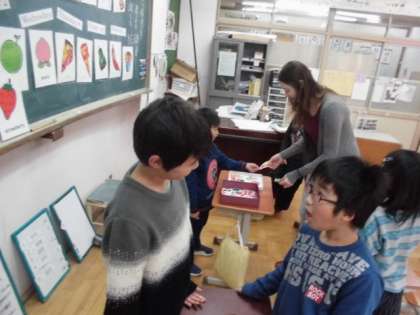What would you like? に対して自分の好きな食べ物を言ってその絵をもらって自分のカードに貼っていきます。外国語指導助手の方ともへっちゃらで、友達同士でも何度でもしていきます。
