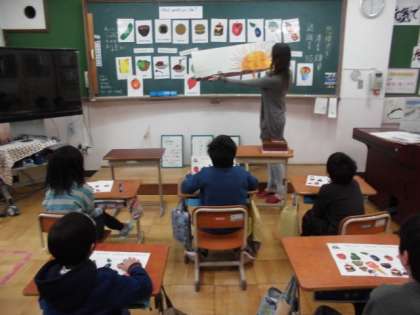 絵本も読んでいただきました。外国の方の話す英語を理解しながら聞きました。話の内容は、何度も聞いているので大体の意味も単語もつかんでいます。曜日や食べ物の名前など自分たちがチャンツや、歌、ゲームなどで親しんでもいますし、実際に自分のカードを作っていきために話したことばが聞こえてきます。