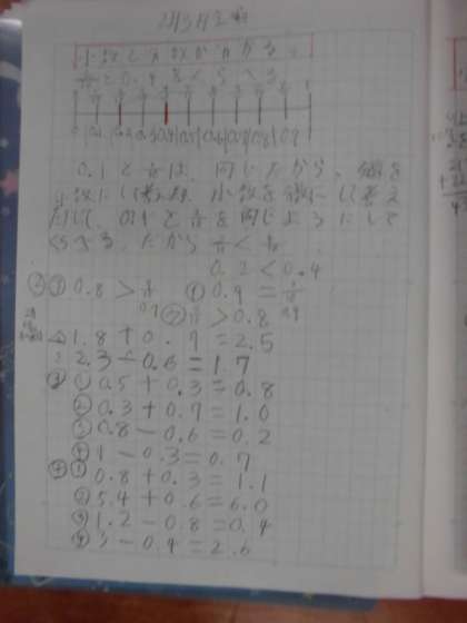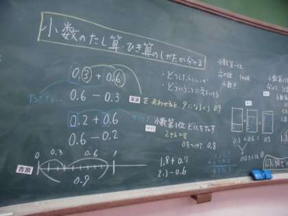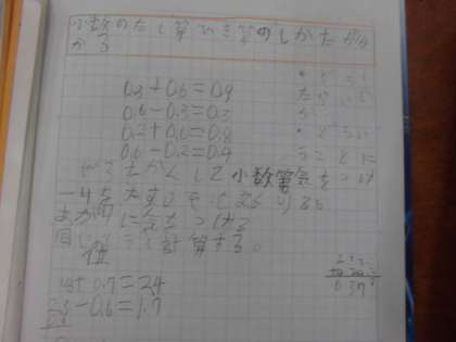 小数計算の仕方を自力解決〜集団解決していき、自分で考えたこと、説明、図を描きました。みんなの考えの交流から、小数第一位、小数点、位をそろえるなどの既習の言葉を使ってやり方をまとめていきました。実際に数値を変えて、計算処理をして確かめました。