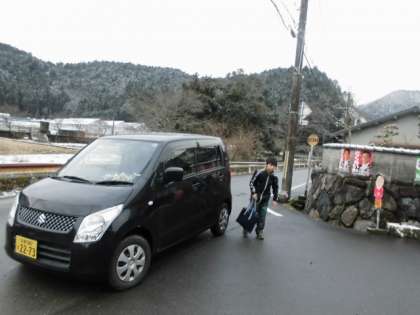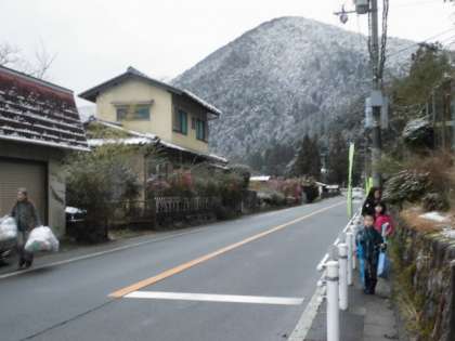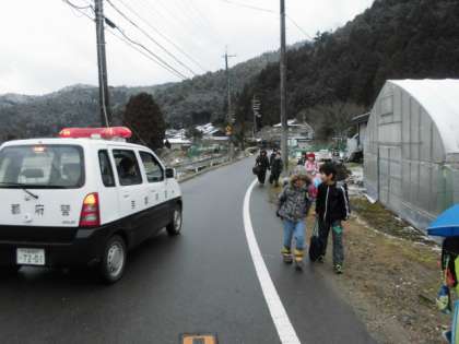 パトカーも見守りをしています。上の町と違うところからの登校も集団登校です。